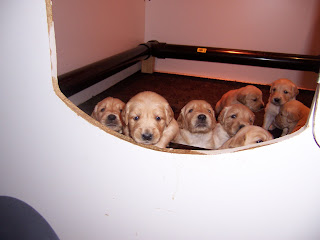 Three and a half weeks old and the fun is really starting. Puppies are very mobile and are start to do fun puppy things like make noises and play. They still can’t really focus, so the playing is very funny – they try to bat at each other with their paws or grab each other with their mouths, but they don’t have very good control, so mostly they fall over. I’ve finally got our webcam to work, so we’re working on having some live feed video available to our puppy owners this week.