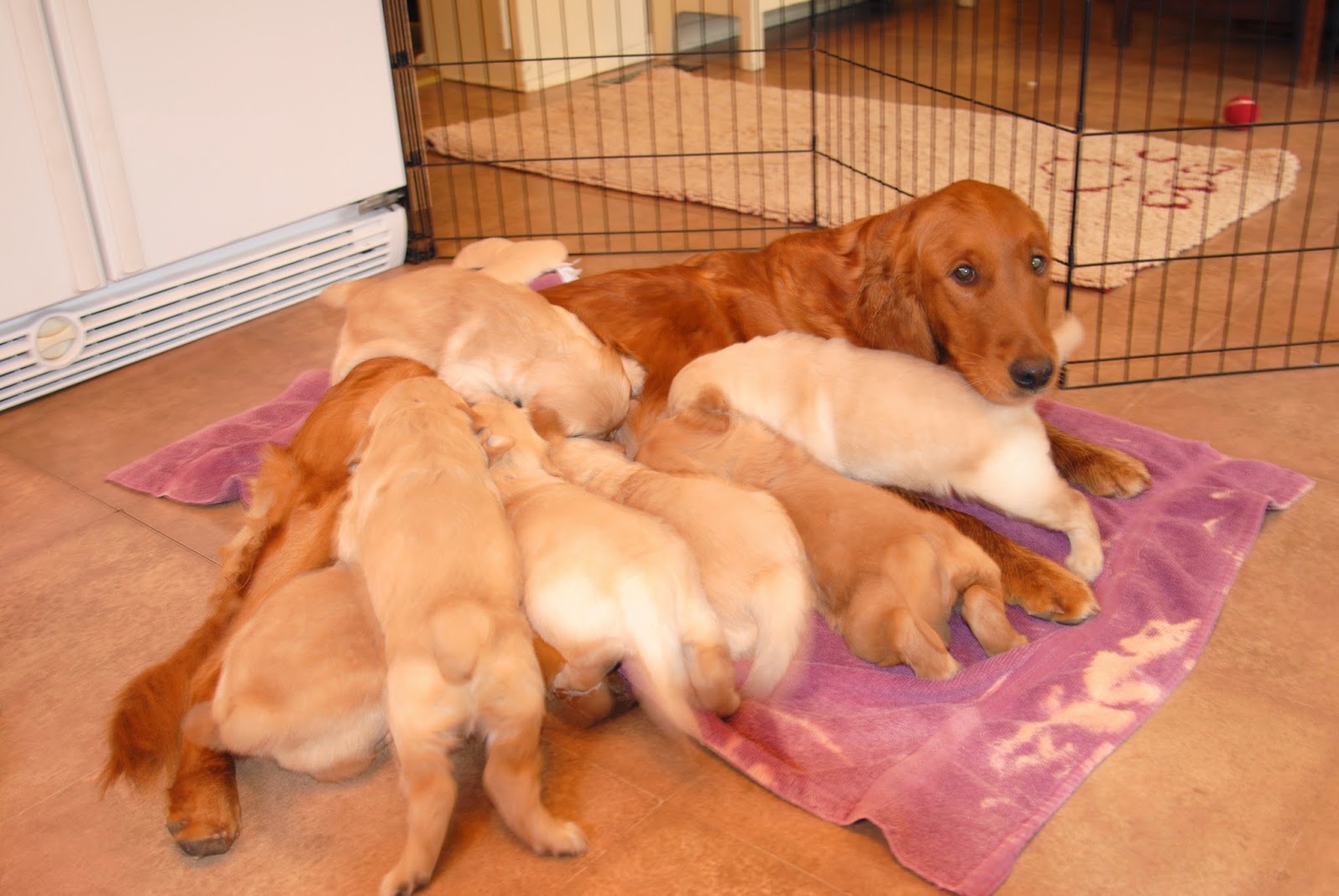 Now that we’re 4 weeks old, bigger adventures begin. We come up to the kitchen and stay there most of the day. We only go in the whelping box at night to sleep. We had our last meal at the “dairy bar”. Now that we have teeth, Mom isn’t very interested in feeding us anymore. We’ve been outside on the deck and we’re learning to climb through things and around things and we bark A LOT.