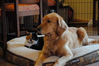 It’s been “stupid boy” week at our house this week. Well, actually it’s been more like “stupid boy” month. We’ve had a couple of girls in for breeding and now Bree’s in season as well. Seems all we’ve been doing is spending all kinds of time and effort making sure that boys don’t come in contact with girls. For us, that means multiple gates and multiple crates and boys getting exercised separate from girls. Here’s Bree with her new best friend, Aggie the cat.