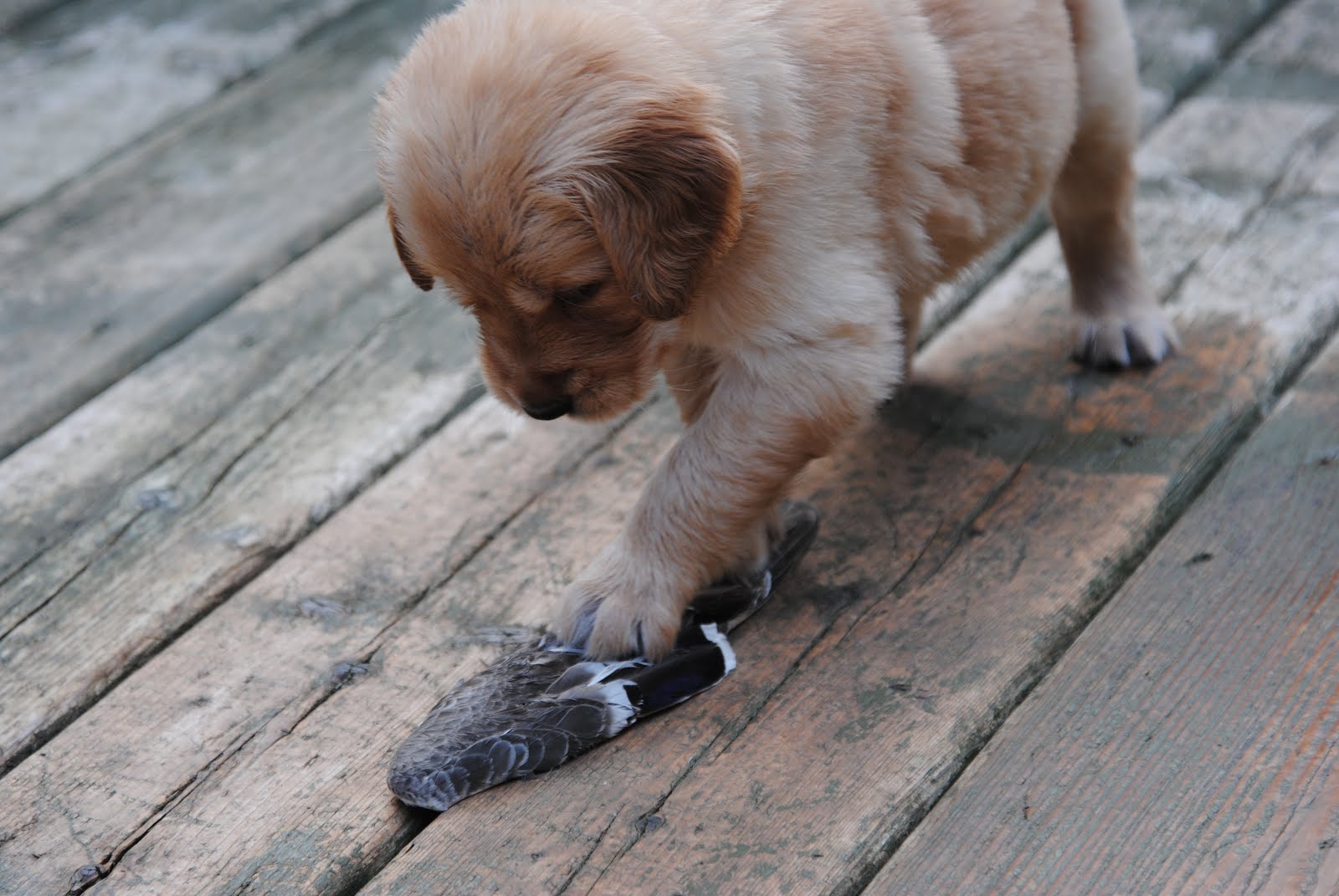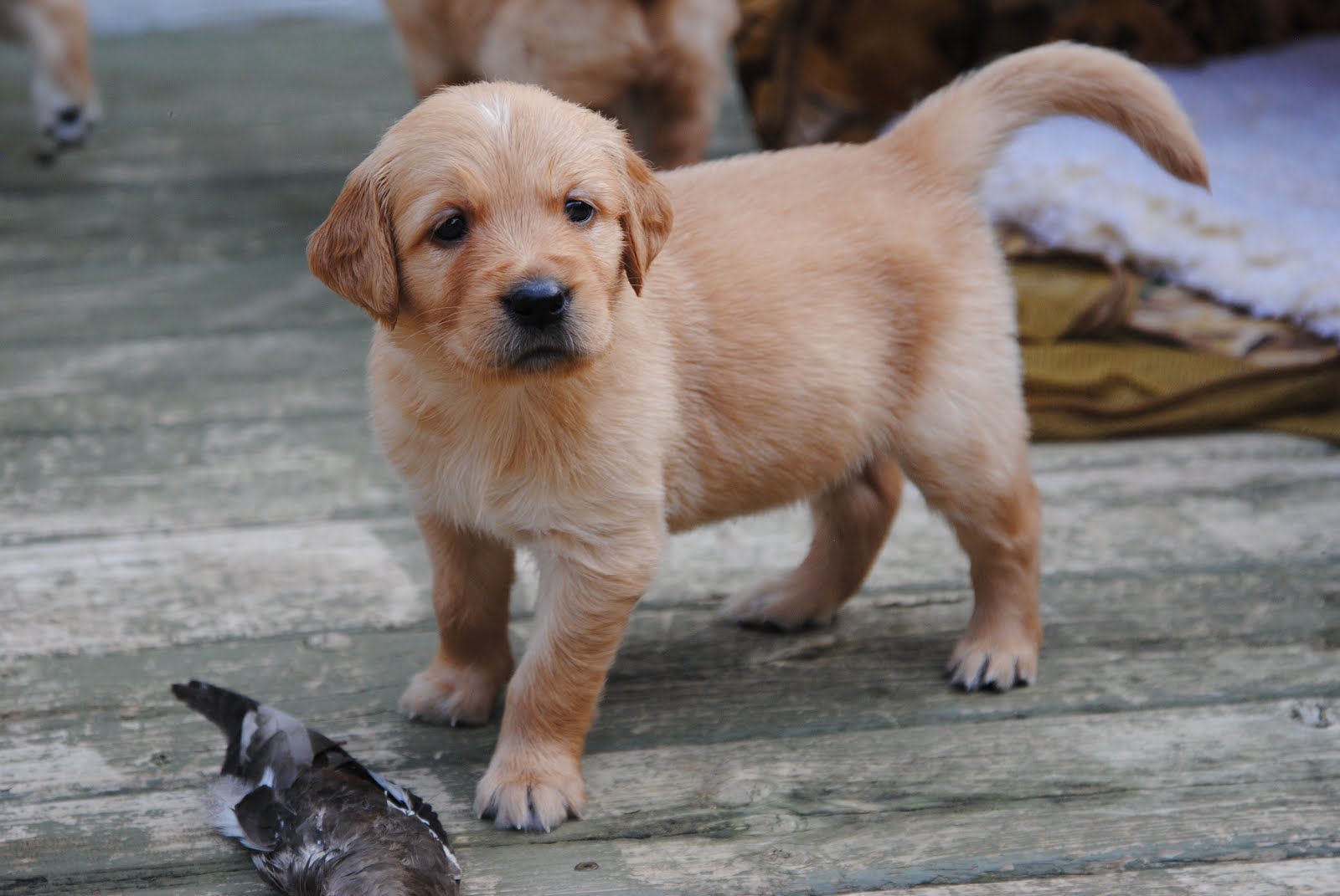 Puppies are growing like weeds this week! This is the age where they start to be a whole bunch of fun. They’re starting the explore the world around them, so we do our best to expose them to as many new sights and sounds as we can. They’ve played with lots of new toys this week and have done a bit of retrieving. They’ve spent some time in the dog hut, have run around the deck and the yard and spend most of their day running around…and BARKING!