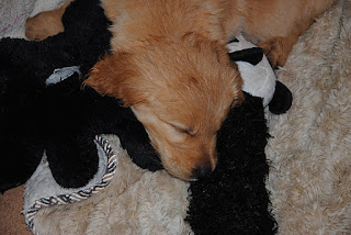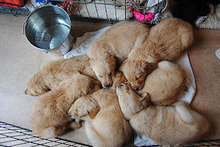 We’re soooo pooped. We went training in the field today with the big dogs. We had a ride in the truck, a big walk in very tall grass and we hung out in the exercise pen while people picked us up and admired us. Then we came home and ran around the yard for a while in the rain. Now we’re sleeping – some of us are even snoring…