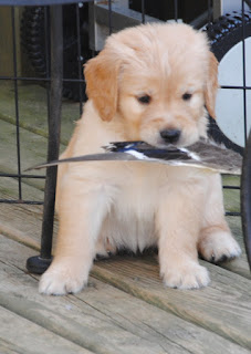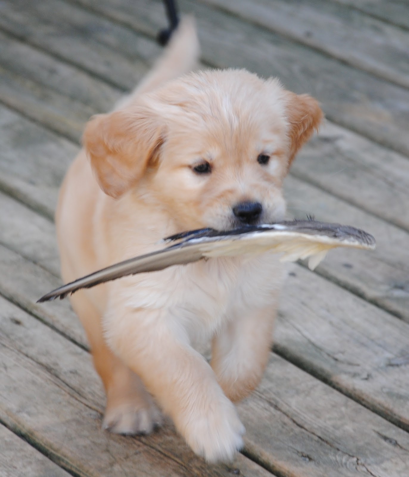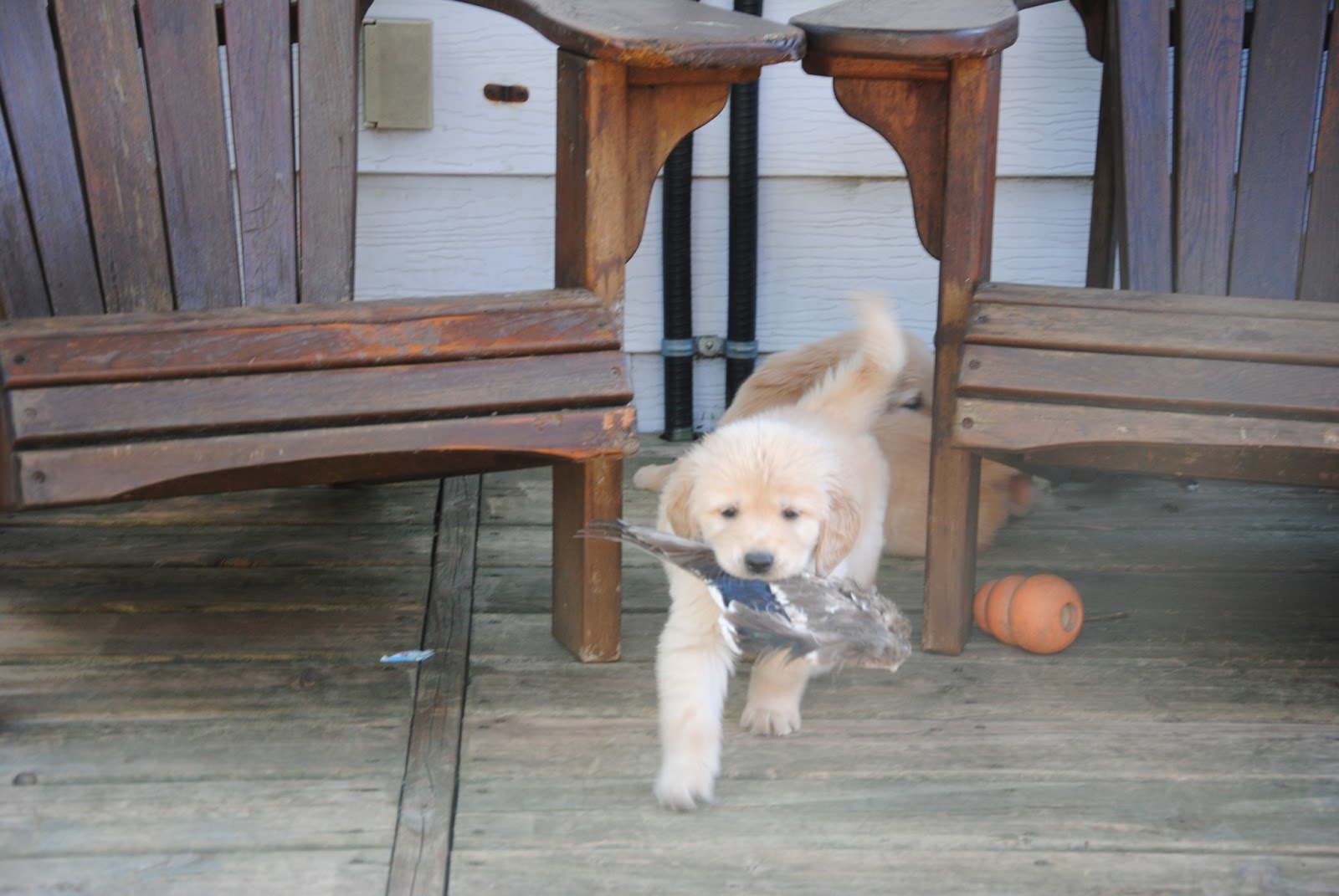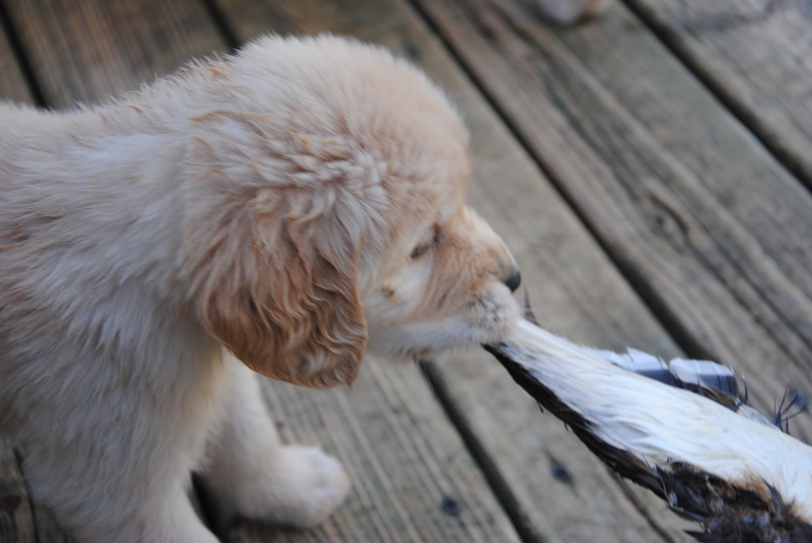 Fun with Wings by Site Admin | Jun 15, 2013 | blog The puppies got to play on the deck with duck wings today. It’s very hard to take pictures of puppies with wings, because they’re really FAST and because they do their best to run away with them. They had a ton of fun.