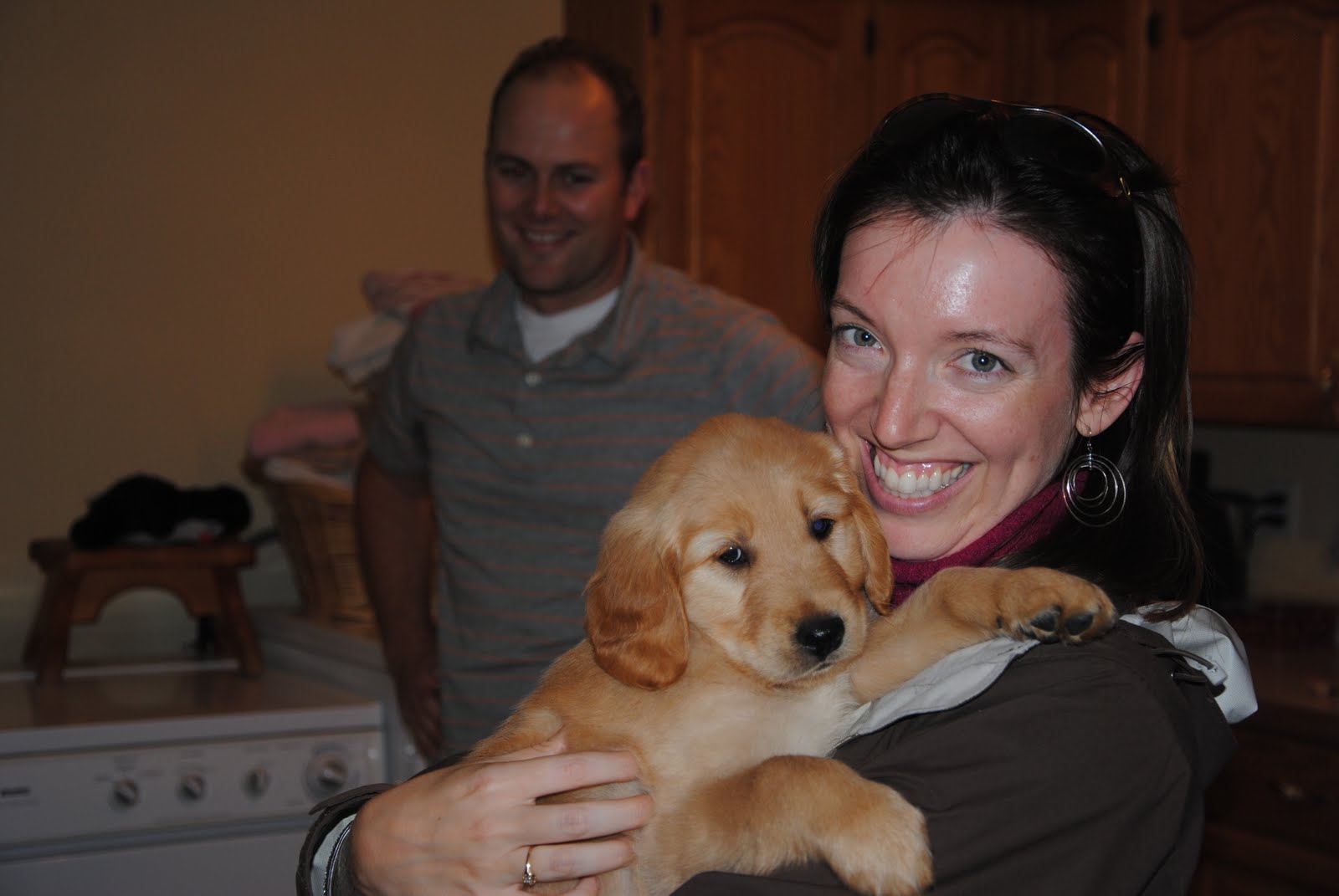 Our little ones start to head to their forever homes this weekend. This is always a tough time for us. We love that these little guys will head off to such great homes where they’ll have all the individual love and attention that they’ll need to grow up into excellent canine citizens. But it’s very sad for us to have the little creatures that we’ve watched grow from specks on an ultrasound into these very fun bundles of fur leave us. On the left is “Barley” with his new people Nick and Trudy. Barley will join Cowboy in their home (and besides, we’ll see him every week at training class!).