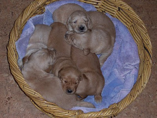 Bree’s babies arrived Good Friday – a bit earlier than we expected. We were out training in Paris and she had her first puppy in the back of the truck. That wee boy was followed in short order by 3 more in the truck on the drive home and 2 more when we got here. She is certainly an efficient whelper! Yesterday (on my birthday) they were 2 weeks old. Their little eyes are starting to open and they are starting to respond when I call “puppy, puppy, puppy”. The larger, blonde boy taught himself to roll over yesterday and proceeded to roll himself all around the box. It was highly entertaining. Mark’s keeping a boy from this litter, so he’s excited to see how they’re growing up.