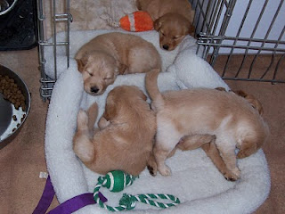 This week the game is like that old “see how many people you can stuff in a volkswagen”. See how many puppies and all their toys will fit in a big dog kennel. On the weekend all the puppies went for a ride in the truck down to Paris and had a big run in the field. We were going to take them swimming, but it was pretty cold so we’ll wait until things warm up a bit. They also got introduced to pigeons this week, which they thought was very fun.