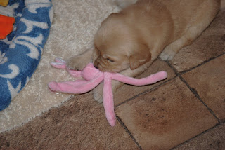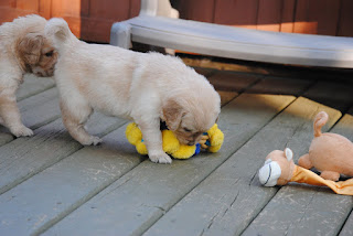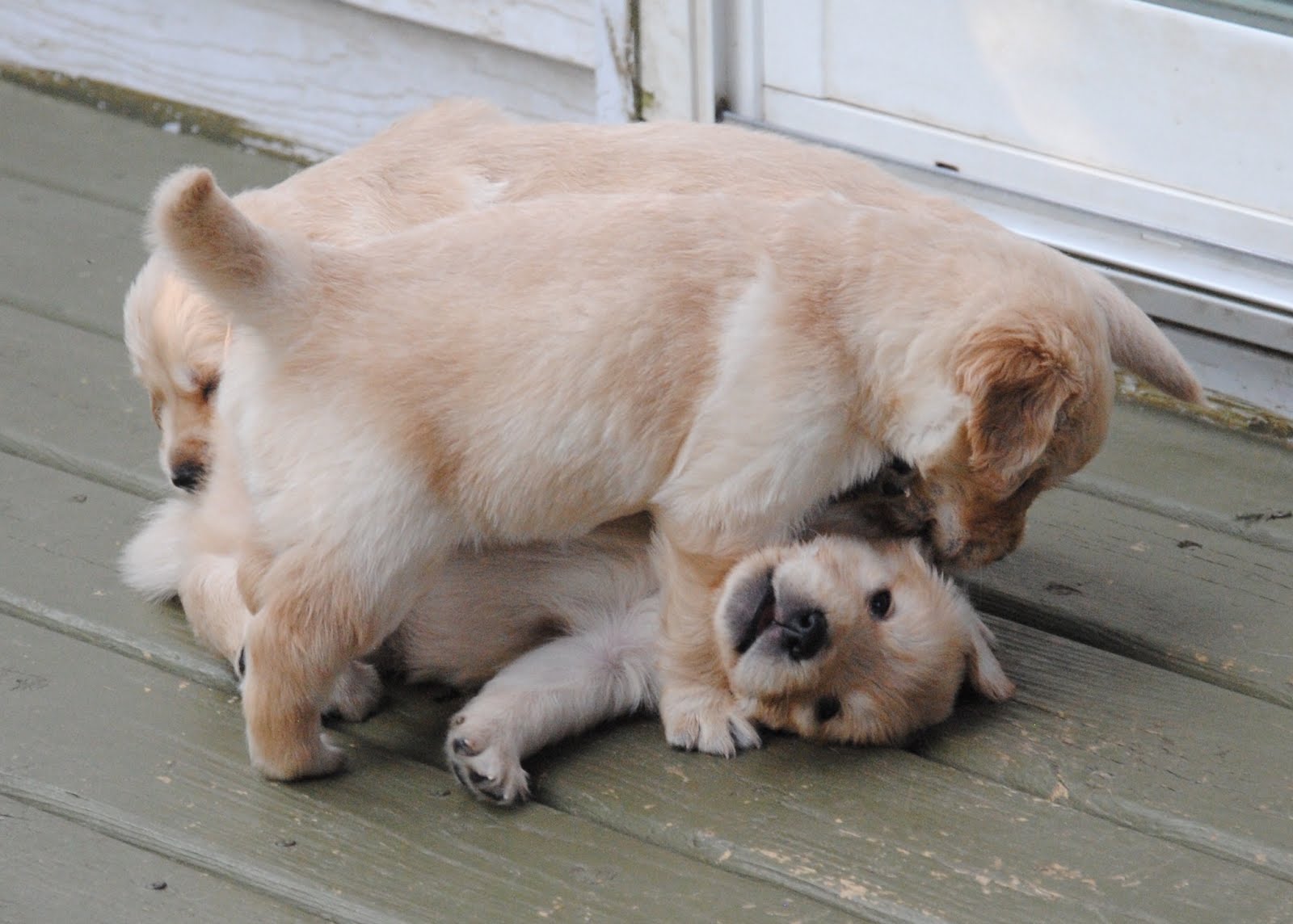 This week, puppies have really began to be very fun. They’re running around, playing with each other, playing with toys and generally having a great time. This week, they have spent most of their time in the kitchen, have explored the deck and have had their first solid meal.