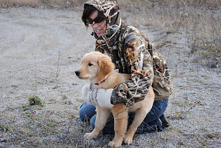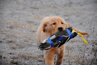 This is Barley (with his owner, Trudy) waiting for his turn, Pippa (yes, she’s a Toller, not a Golden)with Andrea and our Crispin with the winged bumper. All the puppies came out training yesterday with the big dogs and had a great time learning to fetch up the bumpers, getting some exposure to birds through the wings Mark brought back from his Saskatchewan hunting trip and learning to COME BACK with the bumper. It’s great to watch the puppies learn to do stuff that is so fun. We believe very strongly that all the work you do at this stage means so much less work required as the dogs get older. The main thing we teach at this stage isn’t that puppy has to pick up the object – it’s that once you have the object, the game is to come back with it. If you don’t come back, the game is over, but if you do come back, the game continues.