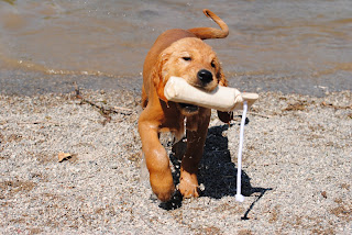 Here he is learning to retrieve bumpers in the water.